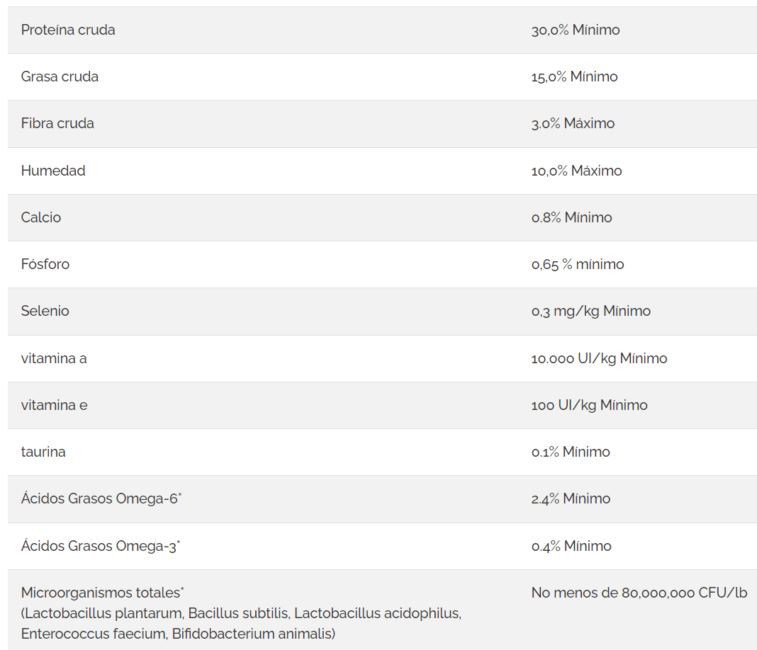 Formulado con probióticos de cepa K9, bacterias beneficiosas que respaldan los sistemas digestivo e inmunológico y ayudan a su perro a mantener un estilo de vida activo. Se garantizarán 80 millones de unidades formadoras de colonias (UFC) por libra.