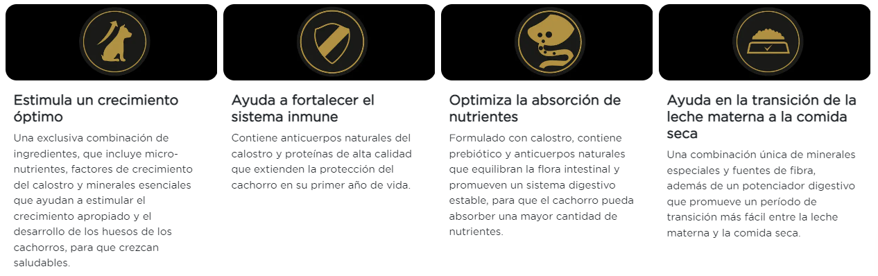 • Una exclusiva combinación de ingredientes, que incluye micro-nutrientes, factores de crecimiento del calostro y minerales esenciales que ayuda a estimular el crecimiento apropiado y el desarrollo de los huesos de los cachorros, para que crezcan saludables.