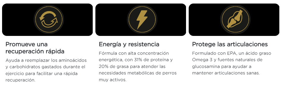 Formulado con alta concentración energética y una mezcla de ingredientes para generar resistencia al ejercicio, mantener la masa muscular sana y proveer energía en los perros de intensa actividad.