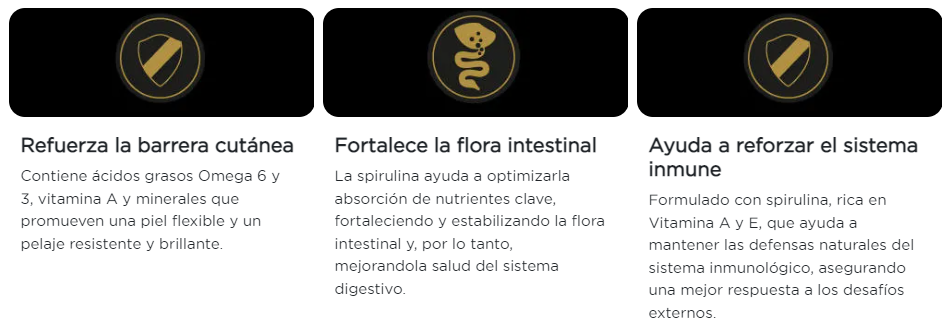 • Contiene ácidos grasos Omega 6 y vitamina A, que sumados a ácidos grasos Omega 3 y minerales, promueven una piel flexible y un pelaje resistente y brillante, actuando como la primera linea de defensa que tiene un perro contra amenazas externas.