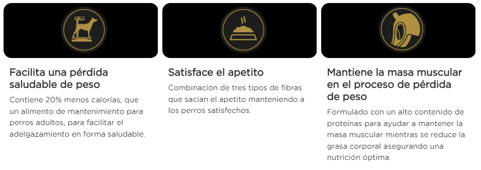 • Incluye tres tipos de fibras que sacian el apetito manteniendo a los perros satisfechos.